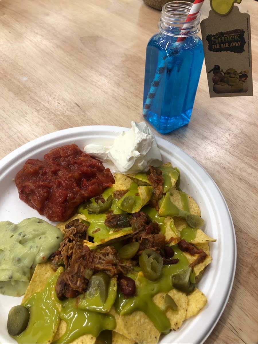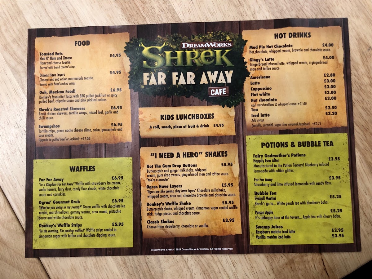 As you sip on the enchanting Potions & Bubble Tea, consider trying the whimsical Eyeball Martini or the enchanting Fairy Godmother's Potions—both perfect companions to your meal. The cafe also offers unique bites like Ooh, Mexican Food and Shrek's Roasted Skewers, which are sure to satisfy cravings for something different. And don’t miss the crowd-pleasing Swampchos—a creative twist on nachos that adds a fun flair to your dining experience.